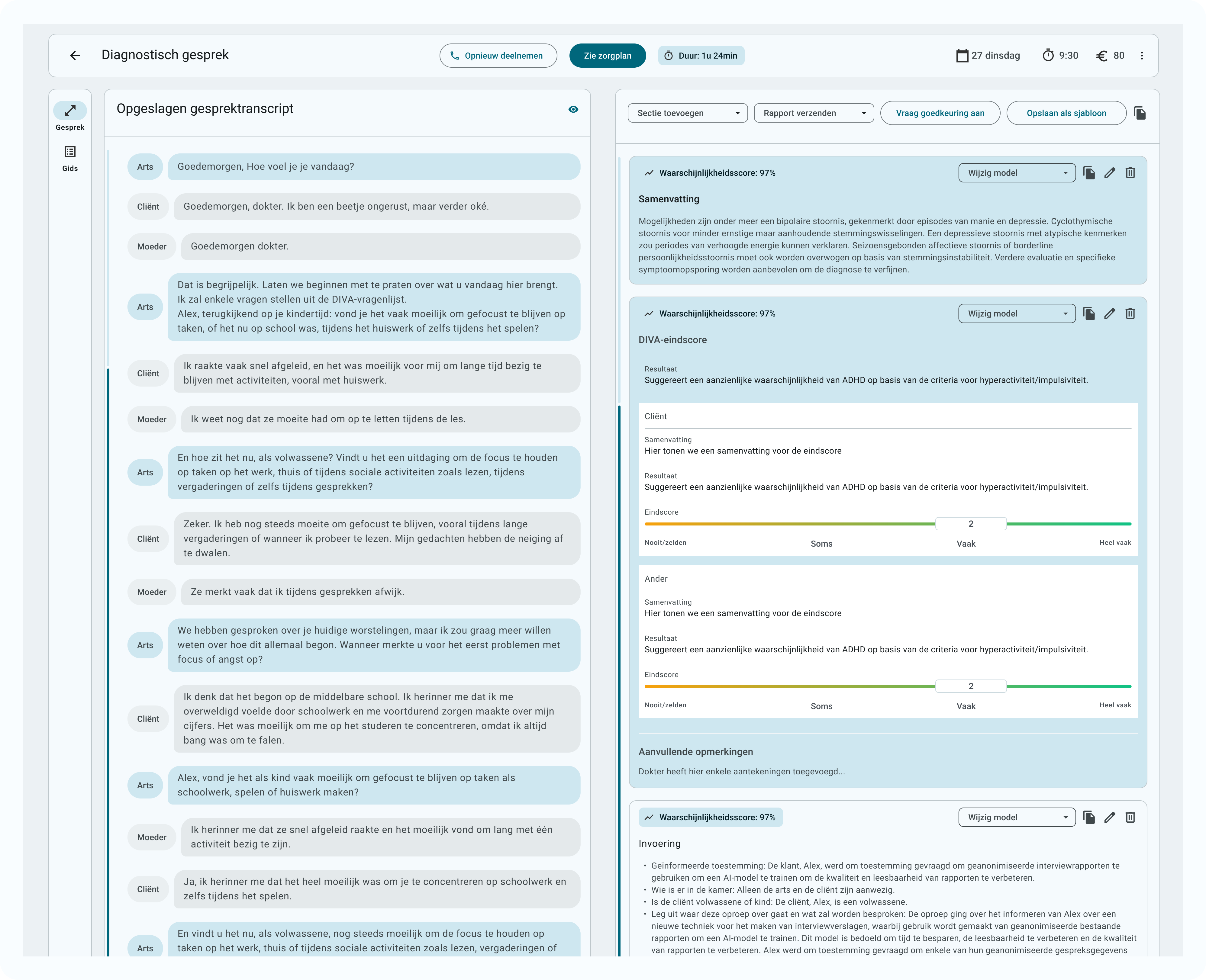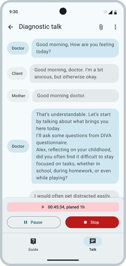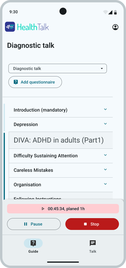 Integrieren Sie nahtlos branchenübliche Beurteilungen der psychischen Gesundheit wie DIVA, NIKA, SCID-5-PD, DSM-5, PHQ-5 und andere direkt in Ihre Sitzungen, um sofortige Erkenntnisse zu gewinnen.