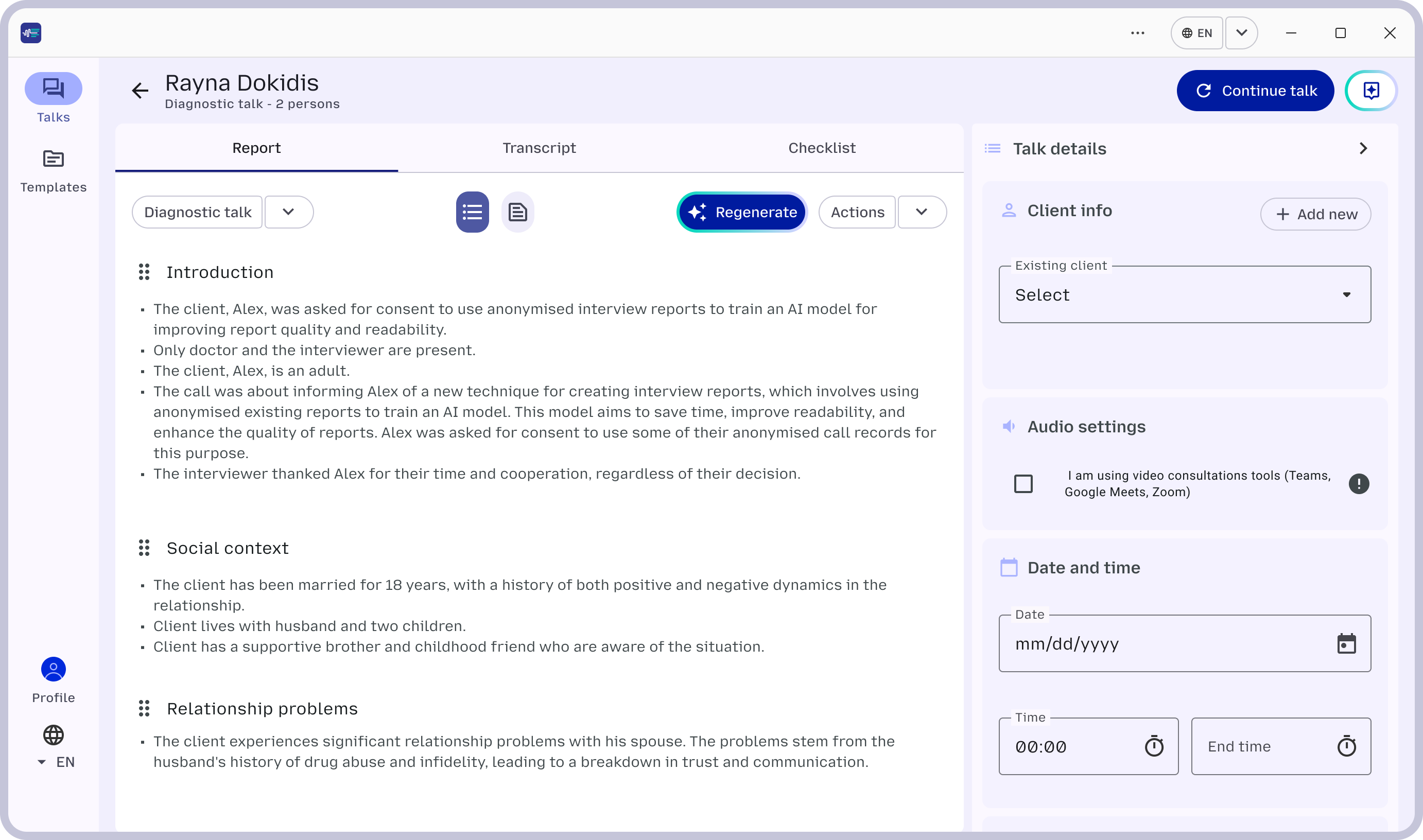 Therapeut Mark opent 's ochtends de desktop app voor zijn eerste sessie. Hij gebruikt spraakgestuurd rapporteren waardoor hij zich volledig kan focussen op zijn client. Het complete geluidsbestand wordt (lokaal) opgeslagen. Ideaal want daardoor kan hij na afloop specifieke nuances terugluisteren. Het gegenereerde verslag van het gesprek controleert hij en dan is hij klaar.