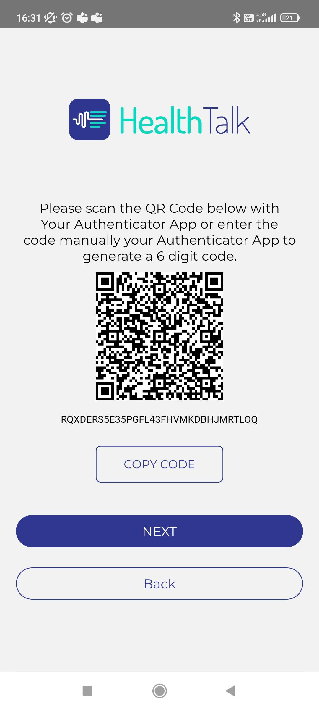 - Voer vervolgens de 6-cijferige code die daar verschijnt in op de inlogpagina van HealthTalk.