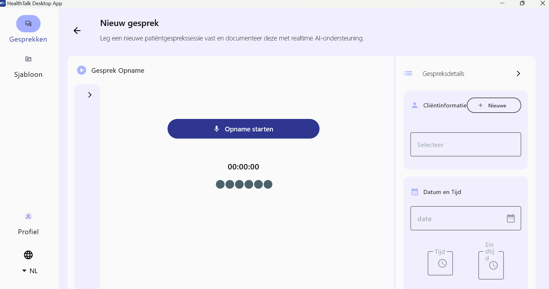 Om een gesprek aan te maken, klik je op Start gesprek en maak je daar een nieuwe cliënt aan, door in ieder geval de naam of ID-nummer in te vullen, en eventueel extra gegevens, zoals het voornaamwoord (de aanspreekvorm voor de cliënt, zijnde hij/zij/het). Ook kies je het gewenste format uit de lijst met beschikbare formats.